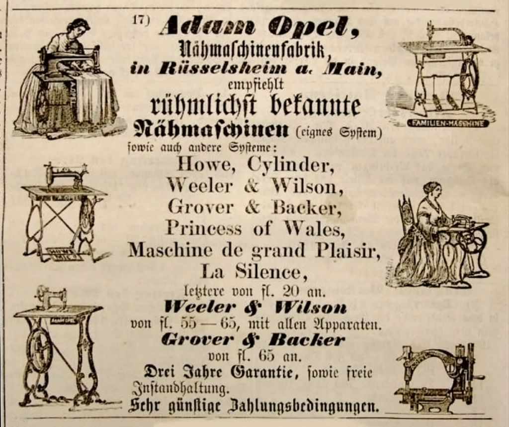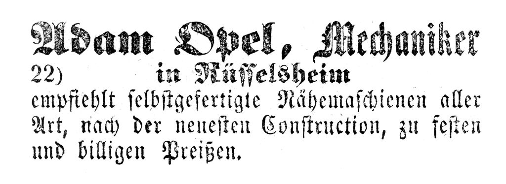 Zmontowanie pierwszej maszyny do szycia zajęło miesiące. Gotowy egzemplarz kupił mistrz krawiecki Hummel z Rüsselsheim, a następnie pracował na nim przez 40 lat. Już wtedy firma działała zgodnie z motto „Niezawodny Opel”. W 1863 r. Opel otworzył pierwszy zakład produkcyjny w nieużywanej oborze należącej do jego wuja. Georg, brat Adama, przysyłał mu z Paryża stal, czółenka, nici i kompletne maszyny do dalszej odsprzedaży. Ukazała się pierwsza reklama produktów firmy, a Adam zatrudnił pierwszego pracownika. Opel nie tylko produkował maszyny do szycia, ale także handlował nimi z dużym powodzeniem.