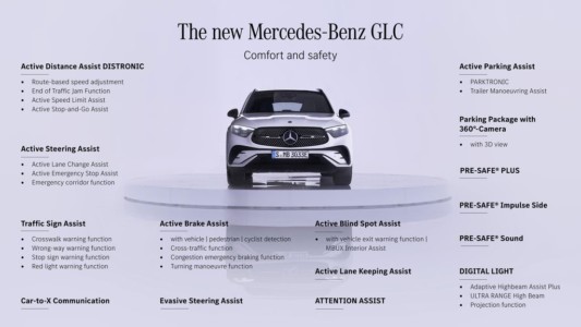 GLC jest popularnym SUV-em do holowania przyczepy, a nowa generacja modelu została do tego celu dodatkowo przygotowana. Dwie najważniejsze nowości w tym zakresie to nowe menu przyczepy i planowanie trasy holowania w systemie MBUX. Napęd na wszystkie koła 4MATIC zapewnia doskonałą przyczepność na każdej nawierzchni. Podczas holowania aktywowana jest stabilizacja przyczepy ESP®. Opcjonalny hak holowniczy jest sterowany w pełni elektrycznie. Obraz z kamery cofania obejmuje hak i obszar bezpośrednio za nim, dzięki czemu proces podczepiania przyczepy można obserwować na centralnym wyświetlaczu. Z kolei opcjonalny Asystent manewrowania z przyczepą sprawia, że jest ono jeszcze łatwiejsze, wygodniejsze i bezpieczniejsze. System automatycznie reguluje kąt skrętu holującego samochodu do prędkości 5 km/h i nachylenia drogi do 15 procent.