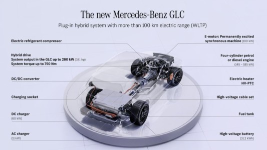 GLC będzie także dostępny z czwartą generacją hybrydowego napędu plug-in na trzech poziomach mocy, z bardziej kompaktowym układem wysokiego napięcia. Ponadto wyższe napięcie systemowe zwiększa moc napędu bez konieczności stosowania przewodów o większych przekrojach. Szczytowy moment obrotowy 440 Nm silnika elektrycznego jest dostępny praktycznie od zera, co zapewnia dużą zwinność podczas ruszania i umożliwia dynamiczną jazdę. W trybie w pełni elektrycznym można poruszać się do prędkości 140 km/h. Wysokonapięciowy akumulator o pojemności 31,2 kWh ma wewnętrzny układ chłodzenia i na życzenie może być szybko ładowany prądem stałym (DC), z mocą do 60 kW. Standardowa ładowarka AC pozwala na ładowanie baterii prądem przemiennym z mocą 11 kW.