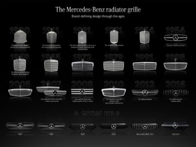 Design osłony chłodnicy w aktualnych modelach Mercedes-Benz to kwestia jeszcze bardziej indywidualna – a przede wszystkim bardziej „rzeźbiarska”. Różne kształty, kontury i listwowanie ułatwiają rozróżnienie poszczególnych gam modelowych bez szkód dla wyrazistego charakteru mercedesowskiego grilla, zapewniając unikalność pod względem tożsamości i wartości rozpoznawczej. Mercedes jest zawsze wyraźnie rozpoznawalny jako Mercedes – w każdej epoce, już od ponad 120 lat.