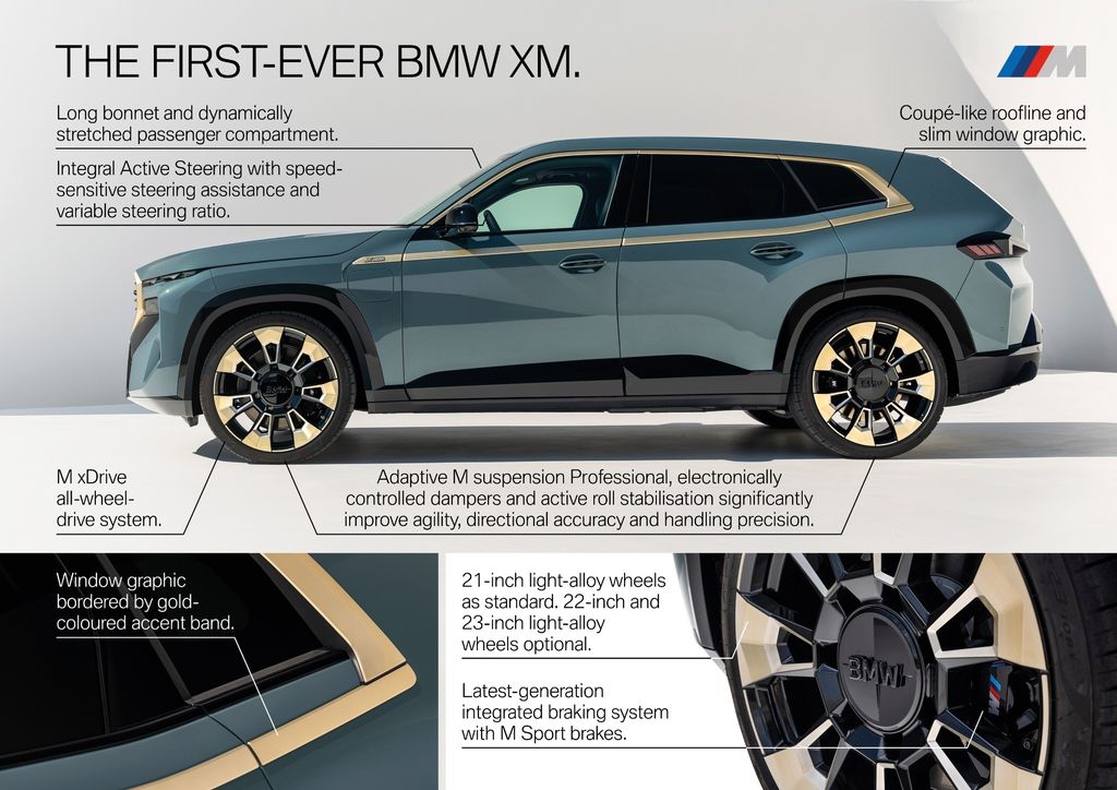 BMW XM jest punktem kulminacyjnym ofensywy modelowej w jubileuszowym roku marki, a także pierwszym oryginalnym samochodem BMW M od czasu BMW M1. Odpowiednio postawione akcenty w wyglądzie zewnętrznym SAV-a o wysokich osiągach nawiązują do legendarnego samochodu sportowego z silnikiem centralnym. BMW XM będzie produkowane w od grudnia 2022 roku amerykańskich zakładach BMW Group w Spartanburgu, a do sprzedaży trafi wiosną 2023 roku. Najważniejszymi rynkami zbytu będą USA, Chiny i Bliski Wschód.