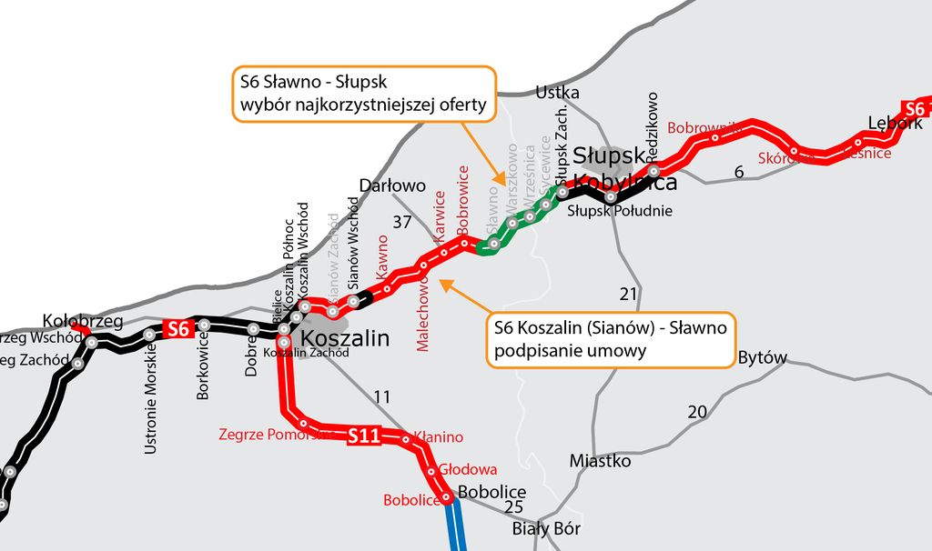 Zakończenie inwestycji przewidziane jest na koniec sierpnia 2025 roku. Obecnie wybrano najkorzystniejszą ofertę w przetargu na realizację sąsiedniego odcinka S6 Sławno – Słupsk. Jest to oferta firmy Stecol o wartości 701,6 mln zł. Pozostali wykonawcy mają 10 dni na ewentualne odwołania od wyboru oferty.