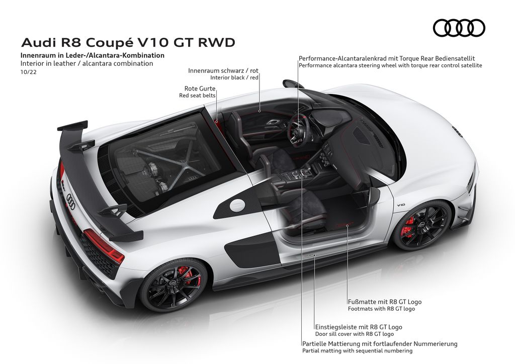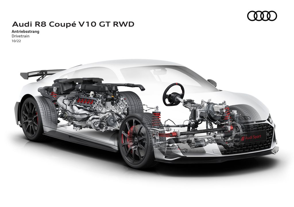 Nowa, siedmiobiegowa dwusprzęgłowa skrzynia biegów zapewniająca szybsze zmiany oraz nowy tryb jazdy Torque Rear, pozwalają kierowcy wybrać poziom wsparcia systemu ESC. Umożliwia to wejście w kontrolowaną, a jednocześnie precyzyjną nadsterowność. Siedmiostopniowym, spersonalizowanym sposobem przesyłu momentu obrotowego na tylną oś steruje się za pomocą obrotowego przełącznika na kierownicy. Seria produkcyjna nowego R8 GT jest limitowana do 333 sztuk. Nowe, ekskluzywne dodatki zewnętrzne i wewnętrzne stanowią hołd dla pierwszej generacji R8 GT. Należą do nich np. indywidualna numeracja egzemplarzy, specjalne felgi ze stopów lekkich oraz wnętrze w kolorach czerni i czerwieni. Nowe Audi R8 Coupé V10 GT RWD będzie dostępne dla klientów w roku 2023.