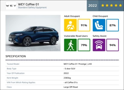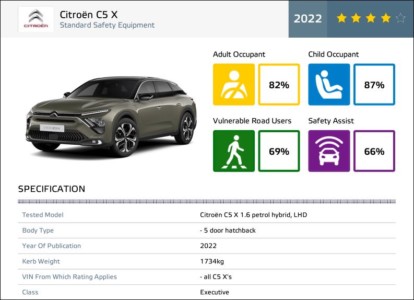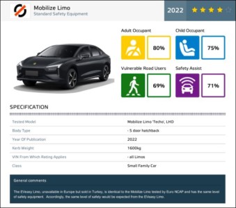 Dwa pozostałe samochody wyprodukowane w Chinach w tej partii otrzymują cztery gwiazdki. Citroën C5 X, zbudowany w Chinach przez spółkę joint-venture Dongfeng Peugeot-Citroën Automobile, oraz elektryczny sedan Limo od Renault-Jiangling joint-venture Mobilize są generalnie solidnymi osiągami, ale nie wyróżniały się brakiem wyposażenia lub marginalnym wyniki w niektórych aktywnych testach bezpieczeństwa.