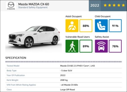 Do uzyskania pięciogwiazdkowej oceny przyczyniła się technologia Skyactiv Multi-Solution Scalable Architecture, zawierająca liczne udoskonalenia zapewniające doskonałą dynamikę jazdy. Kolejną kluczową rolę w uzyskaniu maksymalnych not odgrywa bogata oferta firmowych, zaawansowanych technologii bezpieczeństwa i-Activsense wspierających kierowcę, w które wyposażony jest pojazd. Nowe technologie, wśród których znajdują się system monitorujący ruch poprzeczny przed pojazdem (FCTA), system wspomagający hamowanie podczas cofania (SCBS-R) system wykrywający pieszych i rowerzystów w czasie jazdy czy układ wykrywający pojazdy w martwym punkcie i ostrzegający przed wyjściem z samochodu pod koła nadjeżdżającego pojazdu BSM Vehicle Exit Warning, pomagają kierowcom identyfikować potencjalne zagrożenia i zmniejszać prawdopodobieństwo uszkodzenia ciała lub odniesienia obrażeń, oferując jednocześnie wysokie standardy skuteczności ochrony pieszych i rowerzystów.