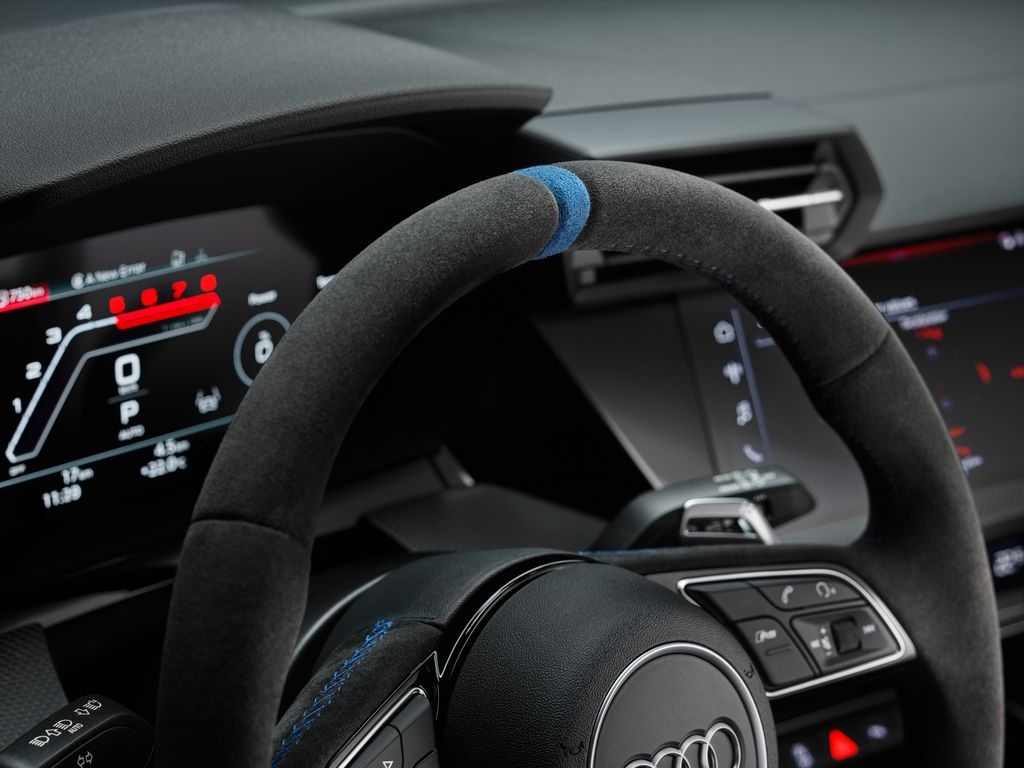 Limitowana seria podkreśla swoją ekskluzywność także we wnętrzu pojazdu. Po raz pierwszy w RS 3 w wyposażeniu standardowym dostępne są fotele kubełkowe, zapewniające doskonałe podparcie boczne podczas dynamicznego pokonywania zakrętów. Panel środkowy foteli z przodu oraz zewnętrzne siedziska tylnej kanapy, mają kontrastowe niebieskie przeszycia w kształcie plastra miodu. Materiałem, z którego je wykonano, jest tkanina z mikrofibry Dinamica, połączona z perłową skórą Nappa na bocznych bolsterach. Poniżej zagłówka, czarny lejkowaty otwór ma duże napisy RS i podobnie jak karbonowy matowy tył oparcia fotela, podkreśla sportowy charakter modelu. Oprócz całych niebieskich pasów bezpieczeństwa, niebieskie są także kontrastowe przeszycia na środkowym podłokietniku, podłokietnikach w drzwiach i na kierownicy. To samo dotyczy dywaników podłogowych i maty bagażnika z czarnego weluru, na których widnieje napis RS. Dla lepszej orientacji podczas sportowej jazdy, spłaszczona u dołu kierownica z Alcantary posiada oznaczenie „godziny dwunastej” – również w kolorze niebieskim.