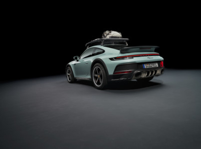 Na dachu Porsche 911 Dakar znajduje się widoczne gniazdko 12 V do zasilania reflektorów opcjonalnego bagażnika dachowego. 42-kilogramowa nośność sprawia, że bez problemu pomieści on sprzęt rajdowy, taki jak kanistry z paliwem i wodą, składane łopaty czy podkładki trakcyjne. Dla 911 Dakar dostępny jest również namiot dachowy.