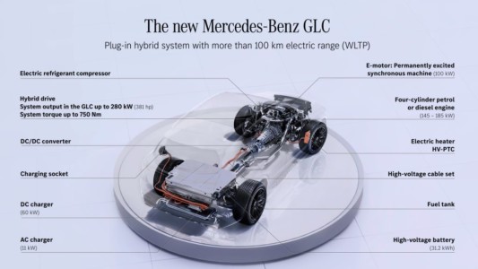Hybrydowe odmiany plug-in GLC oferują znakomite osiągi. Zależnie od wersji ich moc systemowa wynosi od 313 do 381 KM, a systemowy moment obrotowy sięga od 550 do 750 Nm. Pojemny akumulator (31,2 kWh) z możliwością ładowania z zewnętrznego źródła prądu zapewnia nawet 122 km zasięgu w trybie elektrycznym dla realistycznego cyklu mieszanego WLTP. Oznacza to, że większość codziennych podróży można pokonywać wyłącznie siłami prądu – nawet drogami szybkiego ruchu. Prędkość maksymalna GLC w trybie elektrycznym wynosi 140 km/h.