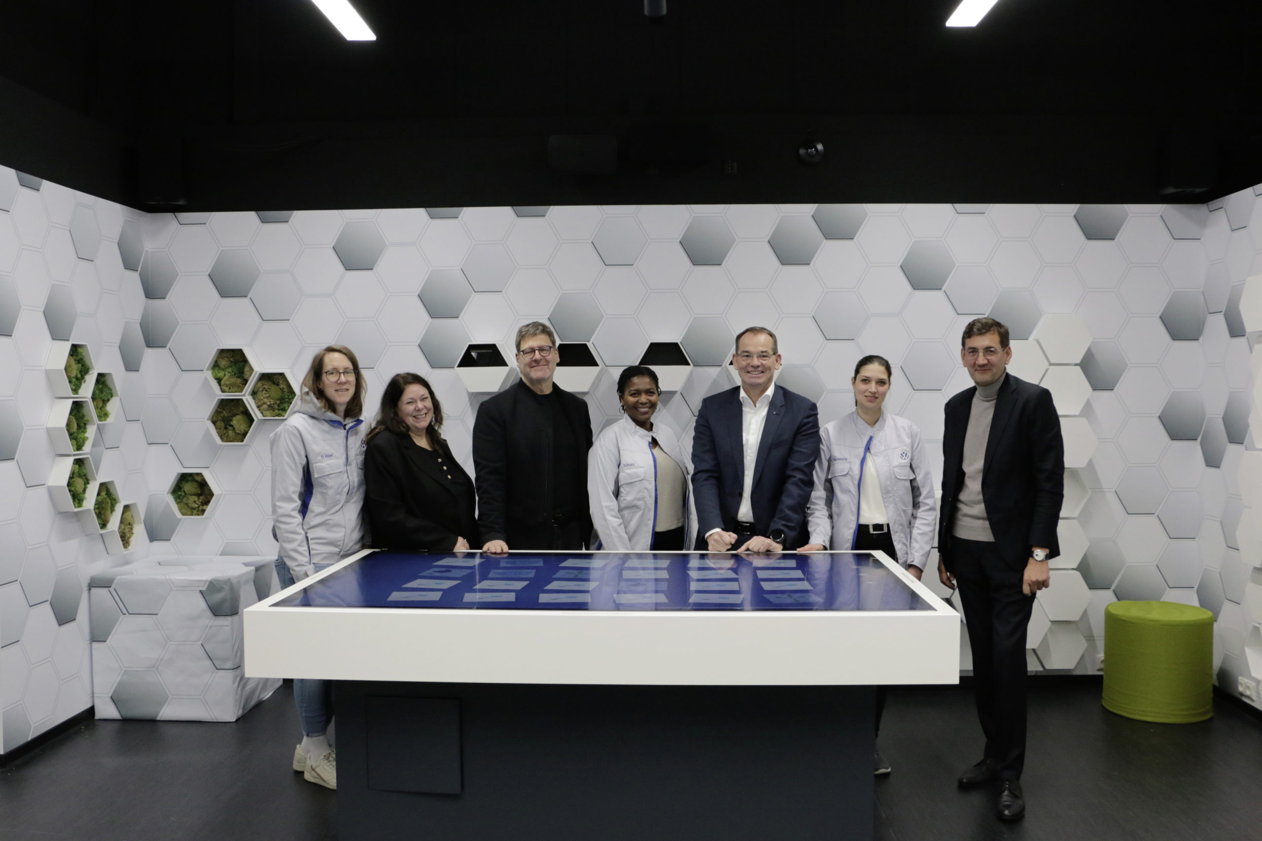 eMotionRoom Wolfsburg: V.l.n.r. Dorothee Kosel, Beratung u. Konzeption digitale Lernszenarien & Medien, Theda Delikan, Teamleitung Lerndesign, Leiter Group Academy Ralph Linde, Loveness Schatz: Sachbearbeiterin Virtual Reality & Fertigkeitentraining, Produktionsvorstand Christian Vollmer, Verena Blumberg: PMO strategische Initiativen, Effiziente Produktion und Kompetenzen, Konzernpersonalvorstand Gunnar Kilian