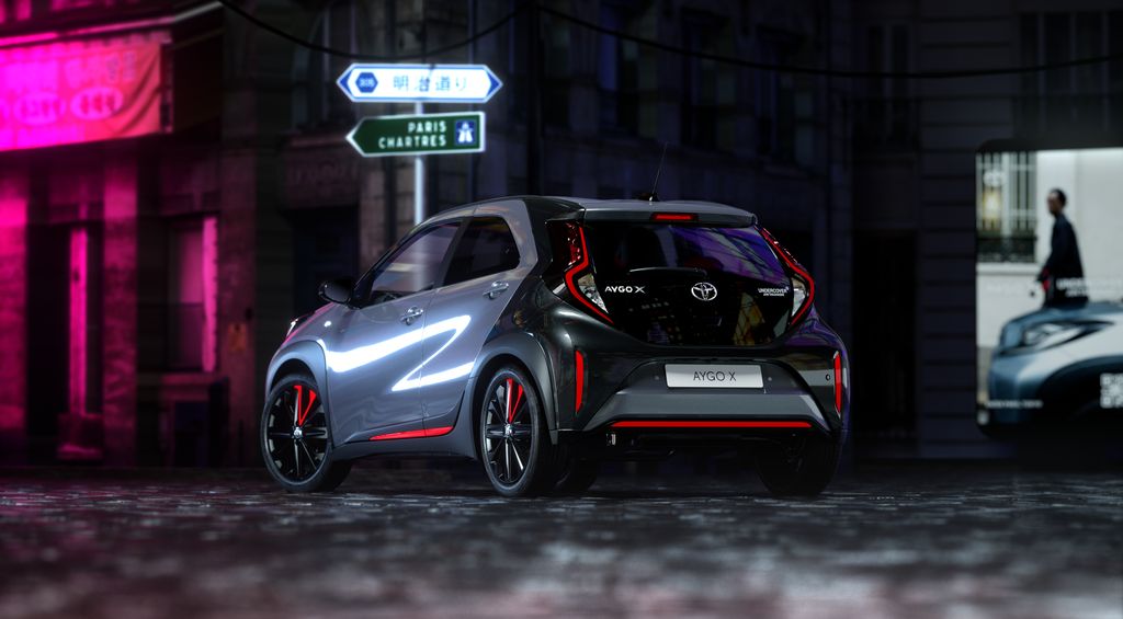Toyota Aygo X w limitowanej edycji UNDERCOVER otrzymało unikalną kolorystykę opartą na specjalnie opracowanych odcieniach oraz elementy stylistyczne związane z marką UNDERCOVER Jun Takahashi, które podnoszą prestiż auta. Kombinacja odcieni szarych lakierów Celestite Grey i Ash Grey tworzą dwukolorową kompozycję, z którymi kontrastują akcenty w odcieniu Coral Red. Kolor ten pojawia się na listwach bocznych oraz na listwie tylnej i na przednim zderzaku, a także w postaci detalu na 18-calowych aluminiowych felgach w kolorze Piano Black. Boki dachu zdobią zaprojektowane przez UNDERCOVER naklejki z hasłem CHAOS / BALANCE.