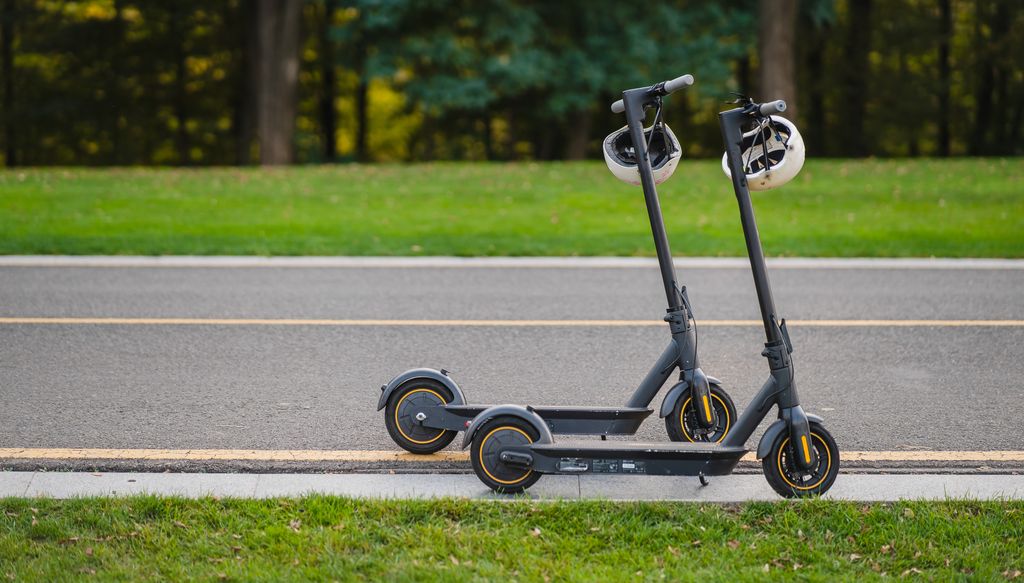 two electric kick scooters or e-scooter parked on the sidelines road in the park
