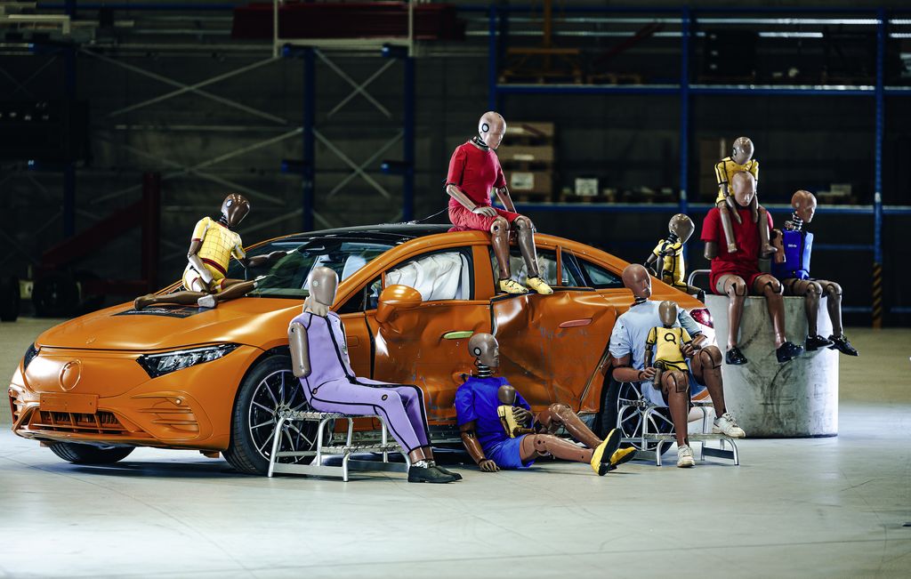 Centrum technologiczne Mercedes-Benz ds. bezpieczeństwa pojazdów w Sindelfingen przeprowadza rocznie aż 900 testów zderzeniowych i 1700 testów z użyciem tzw. sanek. W testach bierze udział 120 manekinów w 21 różnych wersjach – od maluchów, dzieci w każdym wieku i manekinów kobiecych reprezentujących piąty percentyl aż po męskie manekiny na poziomie 50. percentyla (Hybrid III 50 – 1,75 m i 78 kg; 50% mężczyzn jest niższych i lżejszych) oraz większe (Hybrid III 95 – 1,87 m i 101 kg; 5% mężczyzn jest większych i cięższych). Wyniki prób zderzeniowych oraz badań wypadków są wykorzystywane do opracowywania nowych rozwiązań technicznych w obszarze bezpieczeństwa oraz do doskonalenia istniejących systemów.