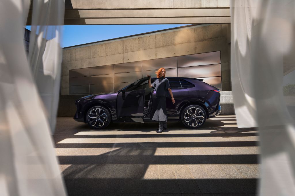 Mazda CX-6e przenosi język stylistyczny Kodo – Soul of Motion w przyszłość elektromobilności. Jej odważny motyw „Futurystycznej, Przepełnionej Duszą Nowoczesności” (Soulful Futuristic Modern) odzwierciedla połączenie najnowocześniejszej technologii i rzeźbiarskiej wręcz elegancji. Wydłużony rozstaw osi wynoszący 2902 mm i krótkie zwisy maskują wszechstronne możliwości przewozowe samochodu, a po złożeniu drugiego rzędu siedzeń pojemność bagażnika wzrasta z 468 litrów do 1434 litrów. Dostępna jest paleta siedmiu kolorów nadwozia, które ożywiają rzeźbione i płynne powierzchnie Mazdy CX-6e, z dominującym kolorem Nightfall Violet – głębokim i błyszczącym odcieniem, który w zależności od oświetlenia zmienia się od lśniącego fioletowego blasku do niemal czarnych cieni.